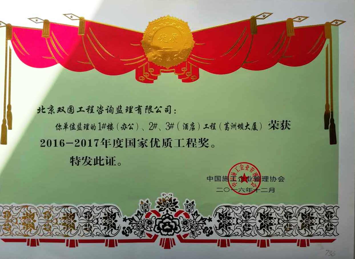 近日我公司監(jiān)理的葛洲壩大廈(1#辦公樓,2#、3#酒店)獲得中國施工企業(yè)管理協(xié)會頒發(fā)的《2016-2017年度國家優(yōu)質(zhì)工程獎(jiǎng)》。
