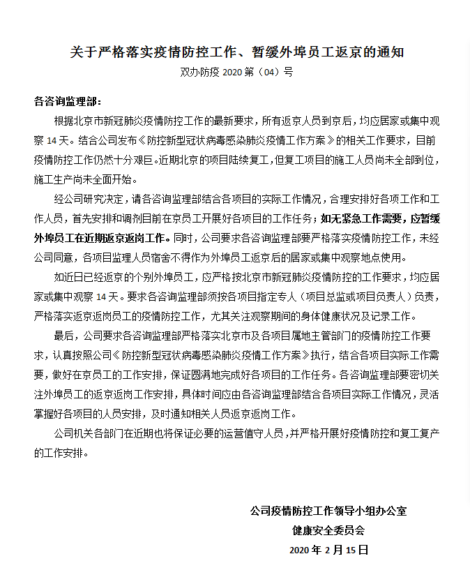關(guān)于嚴(yán)格落實(shí)疫情防控工作、暫緩?fù)獠簡(jiǎn)T工返京的通知