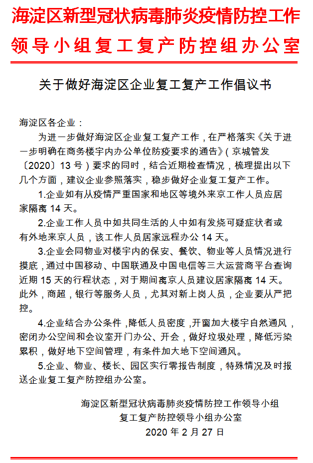 關(guān)于做好海淀區(qū)企業(yè)復(fù)工復(fù)產(chǎn)工作倡議書