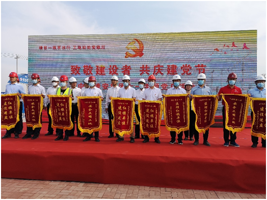 本次活動首先請參會人員觀看了短視頻《致敬先鋒》,并由中國雄安集團黨委副書記、總經(jīng)理劉忠林為參建企業(yè)代表授黨旗,由劉媛帶領所有黨員重溫入黨誓詞,由翟偉為2家項目代建企業(yè)授“投資建設進度流動紅旗”、盛智平為5家施工總承包單位授“安全文明工地流動紅旗”、楊忠為2家監(jiān)理單位授“優(yōu)秀監(jiān)理單位流動紅旗”,我公司承接的商務服務中心項目勇奪“優(yōu)秀監(jiān)理單位流動紅旗”。