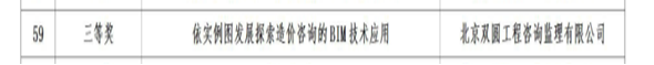 在第一屆北京市建設(shè)工程招標(biāo)投標(biāo)和造價行業(yè)“科技與創(chuàng)新”大會案例評審活動中,北京雙圓工程咨詢監(jiān)理有限公司申報的《依實例圖發(fā)展探索造價咨詢的BIM技術(shù)應(yīng)用》案例,榮獲三等獎。(具體情況詳見附件二)