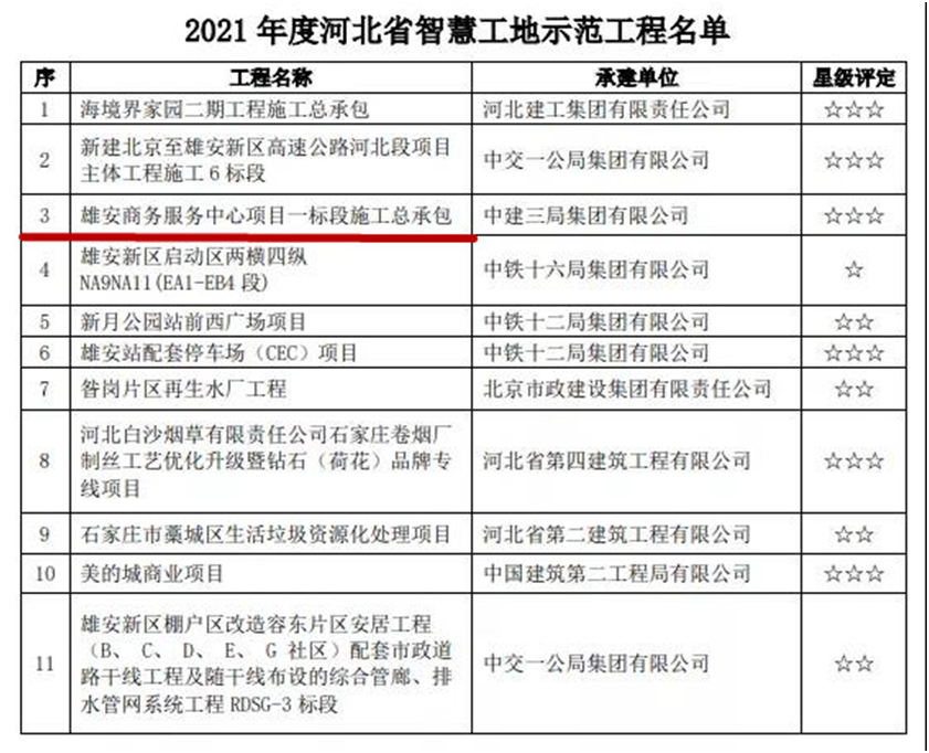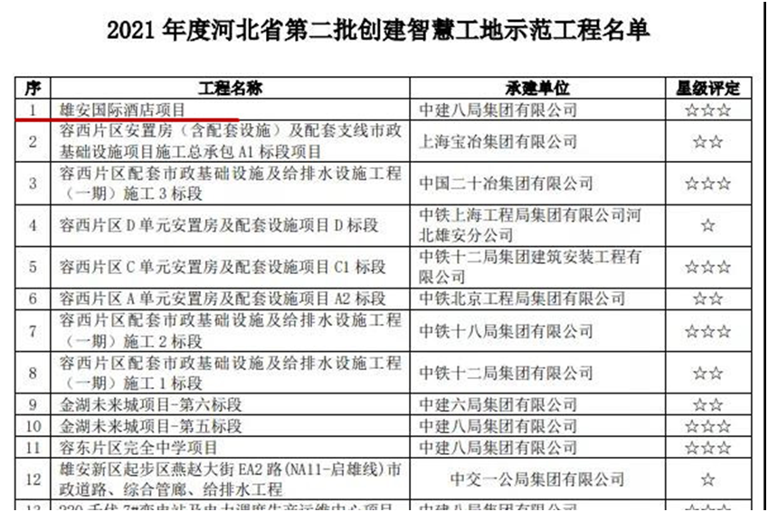 2021年11月由河北省建筑業(yè)協(xié)會(huì)、河北省工程建設(shè)信息智能化協(xié)會(huì)按照河北省《智慧工地建設(shè)技術(shù)標(biāo)準(zhǔn)》(DB13[J]/T8312-2019)及《河北省智慧工地示范工程評(píng)價(jià)管理辦法》(冀建協(xié)字[2020]12號(hào))規(guī)范要求評(píng)定的河北省智慧工地示范工程已發(fā)布榮譽(yù)稱(chēng)號(hào)名單,我公司監(jiān)理的雄安商務(wù)服務(wù)中心一標(biāo)段、雄安國(guó)際酒店兩個(gè)工程都獲得了三星智慧工地稱(chēng)號(hào)。