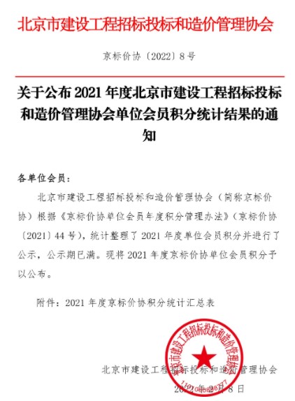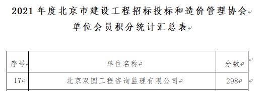 北京雙圓工程咨詢監(jiān)理有限公司2021年度積極參與北京市建設(shè)工程招標(biāo)投標(biāo)和造價(jià)管理協(xié)會組織的各項(xiàng)業(yè)務(wù)評比及交流活動。在2021年度的北京市建設(shè)工程招標(biāo)投標(biāo)和造價(jià)管理協(xié)會單位會員積分為298分,在“京標(biāo)價(jià)協(xié)”568家單位會員中排第17名(詳見附件),連續(xù)兩年進(jìn)入排名20強(qiáng)。
