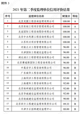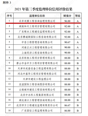 2021年北京雙圓監(jiān)理公司在中國雄安集團(tuán)組織的監(jiān)理企業(yè)季度信用評比中取得了三次A級(其中第二、三季度均獲得第一名),一次B級的優(yōu)異成績。