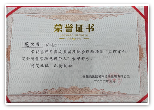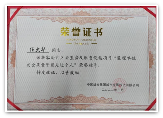 容西片區(qū)B3組團(tuán)安置房項(xiàng)目總監(jiān)理工程師、總監(jiān)代表還被雄安集團(tuán)城發(fā)公司授予“監(jiān)理單位安全質(zhì)量管理先進(jìn)個(gè)人”稱號,這份榮譽(yù)與公司領(lǐng)導(dǎo)的關(guān)心和幫助還有全體項(xiàng)目員工的共同努力密不可分,項(xiàng)目總監(jiān)理工程師代表項(xiàng)目全體員工表態(tài),一定珍惜這份來之不易的榮譽(yù),用更加嚴(yán)格的態(tài)度嚴(yán)把工程安全質(zhì)量關(guān),為實(shí)現(xiàn)容西片區(qū)高標(biāo)準(zhǔn)高質(zhì)量交付的總體目標(biāo)奮勇拼搏,為雙圓監(jiān)理公司在雄安新區(qū)的發(fā)展做出更多貢獻(xiàn)。