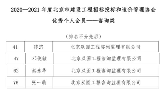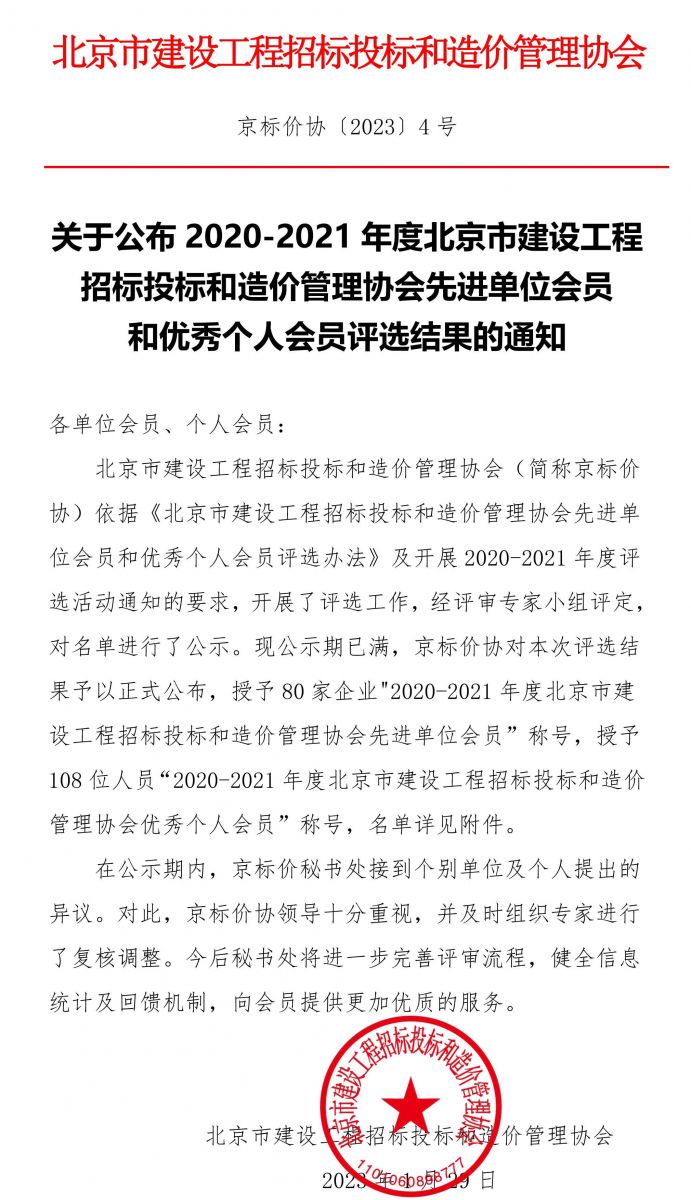 2020-2021年度北京市建設(shè)工程招標(biāo)投標(biāo)和造價(jià)管理協(xié)會(huì)先進(jìn)單位會(huì)員和優(yōu)秀個(gè)人會(huì)員評(píng)選活動(dòng)中。京標(biāo)價(jià)協(xié)授予 80家企業(yè)"2020-2021年度北京市建設(shè)工程招標(biāo)投標(biāo)和造價(jià)管理協(xié)會(huì)先進(jìn)單位會(huì)員”稱號(hào),我司位列被授先進(jìn)單位之中。授予108 位人員“2020-2021 年度北京市建設(shè)工程招標(biāo)投標(biāo)和造價(jià)管理協(xié)會(huì)優(yōu)秀個(gè)人會(huì)員”稱號(hào),其中我司陳濱、鄧俊敏、蔡永華、張一萌等4名同志被授予“優(yōu)秀個(gè)人會(huì)員”稱號(hào)。
