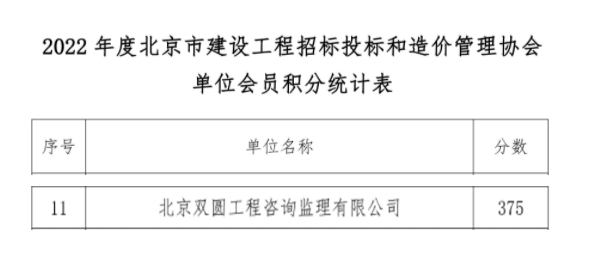 北京雙圓工程咨詢監(jiān)理有限公司連續(xù)三年闖進(jìn)“京標(biāo)價(jià)協(xié)”年度會(huì)員積分前20名,今年在全市613家會(huì)員單位排名中,會(huì)員積分名列第11名。(具體情況詳見附件二)