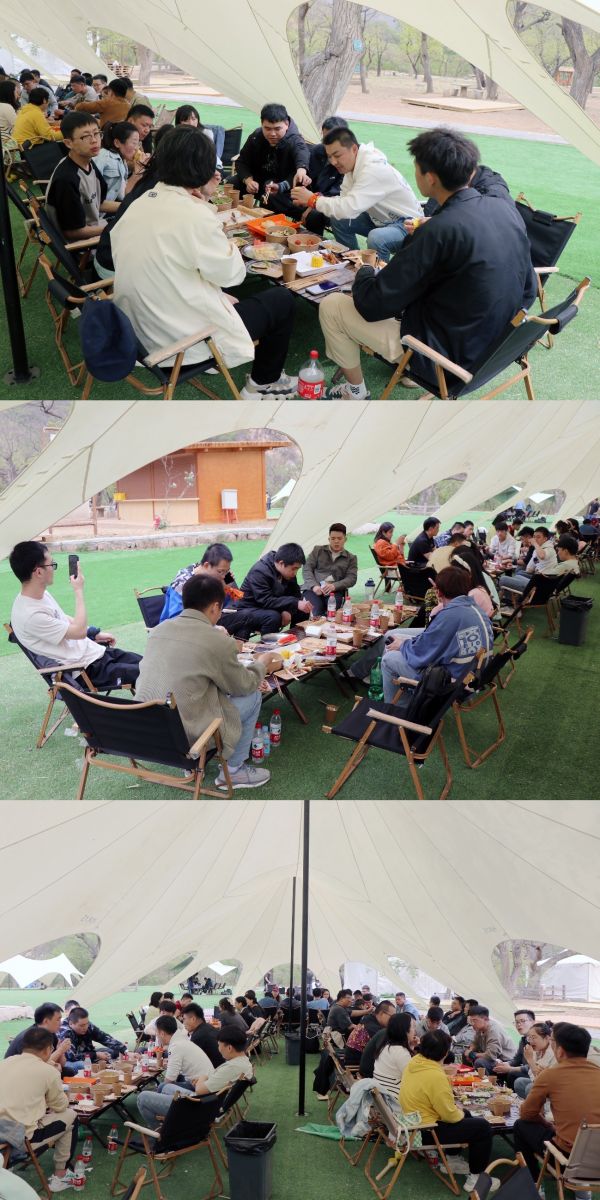 臨近午餐時間,大家陸續(xù)乘興而歸。在豪華天幕下,大家圍桌而坐,吃燒烤、喝飲料,交流感情、暢談天地。
