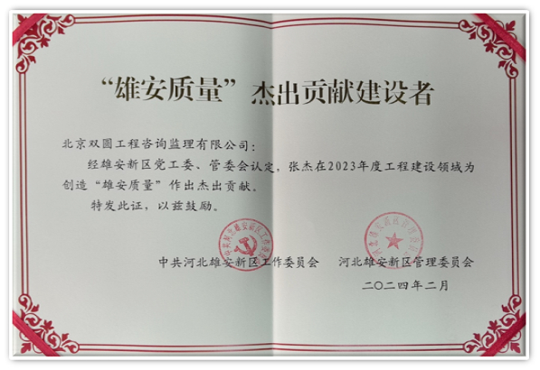 近日,北京雙圓監(jiān)理公司雄安事業(yè)部副經(jīng)理張杰同志被雄安新區(qū)黨工委、管委會評為2023年度工程建設(shè)領(lǐng)域“雄安質(zhì)量”杰出貢獻建設(shè)者,此獎項是新區(qū)參建監(jiān)理單位唯一獲得者。