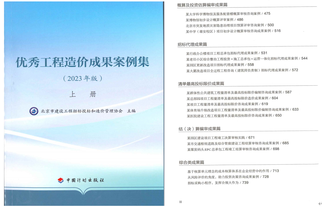 北京市建設(shè)工程招標(biāo)投標(biāo)和造價(jià)管理協(xié)會(huì)主編的《優(yōu)秀工程造價(jià)成果案例集》(2023年版)近期正式出版發(fā)行?!秲?yōu)秀工程造價(jià)成果案例集》是部分榮獲2023年“優(yōu)秀工程造價(jià)成果”獎(jiǎng)的案例集中展示。我公司獲獎(jiǎng)的《某體育場(chǎng)升級(jí)改造項(xiàng)目工程量清單及最高投標(biāo)限價(jià)編制咨詢成果案例》被收錄到案例集中,這是對(duì)我公司造價(jià)咨詢工作的充分肯定,更是對(duì)公司持續(xù)提升業(yè)務(wù)能力和服務(wù)水平的激勵(lì)。在此,感謝主編單位和建設(shè)單位對(duì)我公司造價(jià)咨詢成果案例入選工作的大力支持,特別要感謝北京佳益工程咨詢有限公司郭冬鑫老師的悉心指導(dǎo)。