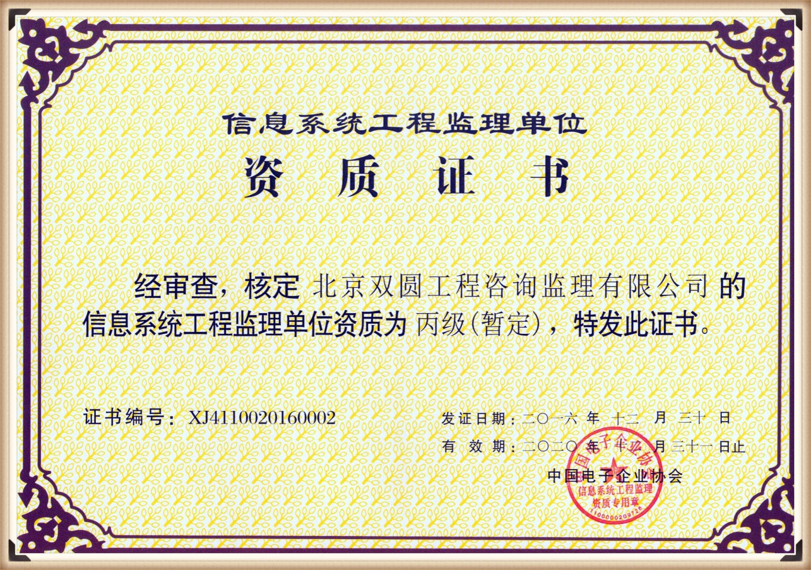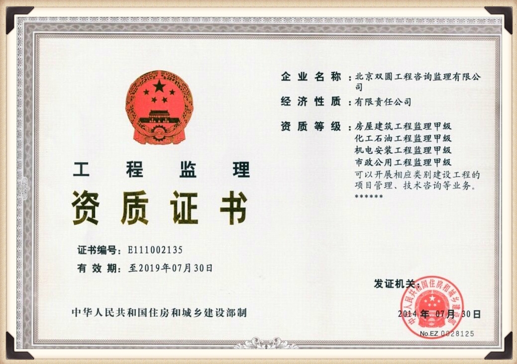 公司擁有中華人民共和國住房和城鄉(xiāng)建設部批準的房屋建筑工程、市政公用工程、機電安裝工程、化工石油工程監(jiān)理甲級資質,同時具備信息系統(tǒng)、人防工程專項監(jiān)理資質,擁有工程咨詢甲級、工程造價咨詢甲級、工程招標代理甲級資質。